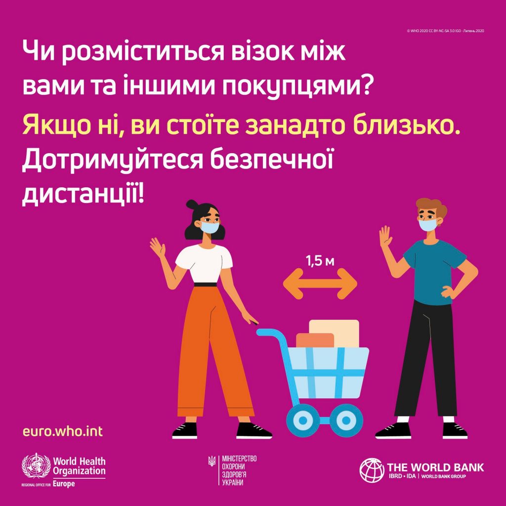 Послания также необходимо адаптировать к местным языковым особенностям, а не просто переводить их дословно, чтобы не упустить никаких смысловых нюансов. В Украине адаптированные плакаты использовались в рамках наружной и цифровой информационной кампании и были широко растиражированы по всей стране, в том числе в районах с высокими показателями заболеваемости COVID-19. Их разместили на рекламных щитах в центрах городов, в магазинах одной из самых крупных сетей супермаркетов в стране, а также в метро в столице страны – Киеве. Проведение этой кампании является частью непрерывной поддержки, которую ВОЗ оказывает Министерству здравоохранения Украины и Украинскому центру общественного здоровья с целью оповещения населения страны о рисках.