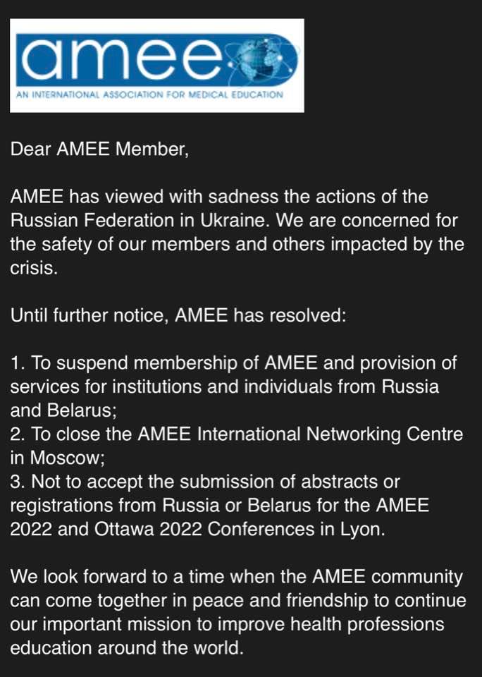 Представителей Российской Федерации и Беларуси изгнали из АМЕЕ, Международной ассоциации медицинского образования.