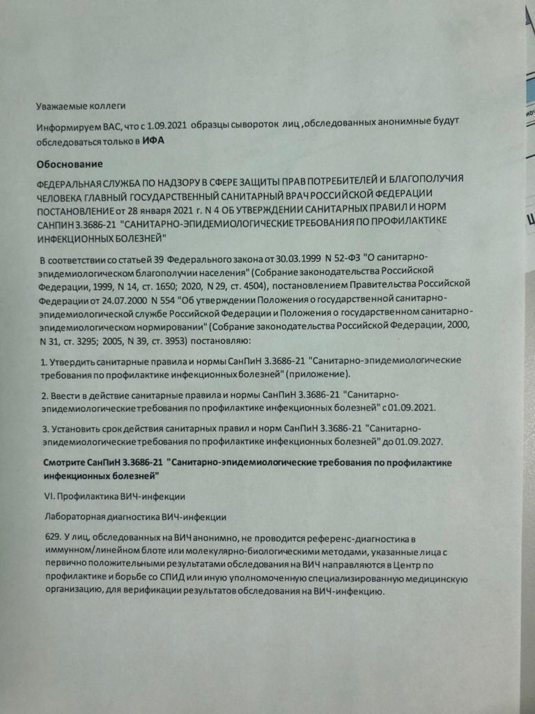 Ранее при анонимном тестировании на ВИЧ человек, получивший положительный результат теста методом иммуноферментного анализа (ИФА), имел возможность также анонимно подтвердить или опровергнуть свой диагноз методом иммуноблота, пишет Региональная экспертная группа (РЭГ) по здоровью мигрантов в Восточной Европе и Центральной Азии. По новым СанПиН 3.3681-21 «Санитарно-эпидемиологические требования по профилактике инфекционных болезней» лица с первично положительными результатами обследования на ВИЧ для верификации результатов направляются в Центр по профилактике и борьбе со СПИД-центрах или другую специализированную медицинскую организацию.